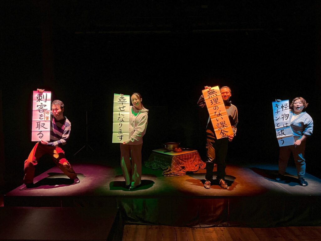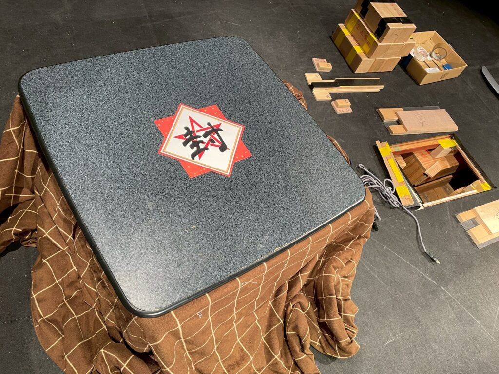 平田:家族は炬燵ありきで明かりを作ってたんだよね。炬燵に集まったときだけシュッと。明かりもシュールに集まりたいなって思ってて。あとは春夏秋冬で4人分の色をつけたいなって悩んで…小屋入るくらいの時にパンフレットを思い出したんだよね。内側の背景をどうしようかなぁ、黒一色は合わないなぁ…あ、年忘れってことは1年なんだから春夏秋冬でいいじゃないか!で、そこから照明も春夏秋冬で色をつけたらいいじゃないか!になった。